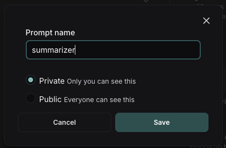 To save your prompt, click the “Save” button, name your prompt, and decide if you want it to be “private” or “public”. Private prompts are only visible to your workspace, while public prompts are discoverable to anyone. The model and configuration you select in the Playground settings will be saved with the prompt. When you reopen the prompt, the model and configuration will automatically load from the saved version.