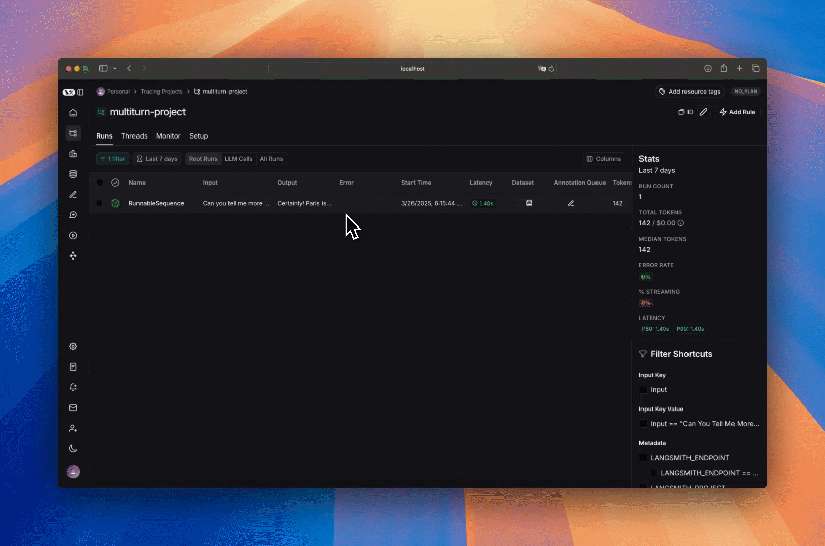 First, ensure you have properly traced a multi-turn conversation, and then navigate to your tracing project. Once you get to your tracing project simply open the run, select the LLM call, and open it in the playground as follows: